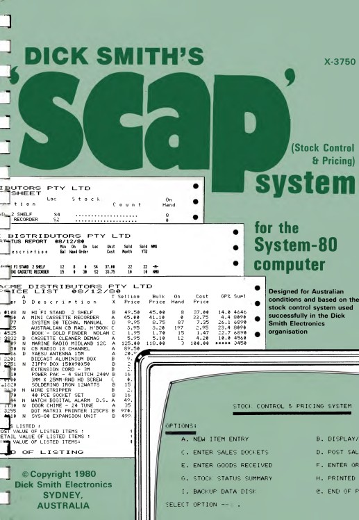 The manual (and the code) assumes the user has a System 80. Although the software could work just as well on a TRS-80 Model 1, that machine is not mentioned. It is clear that Dick Smith saw SCAP as a useful, “serious” application which could help System 80 sales into the small business market. Figure 1 shows the ideal hardware; A System 80 (preferably the MKII business variant), a dedicated monitor, disk capable with two drives and a printer. The full deal!
