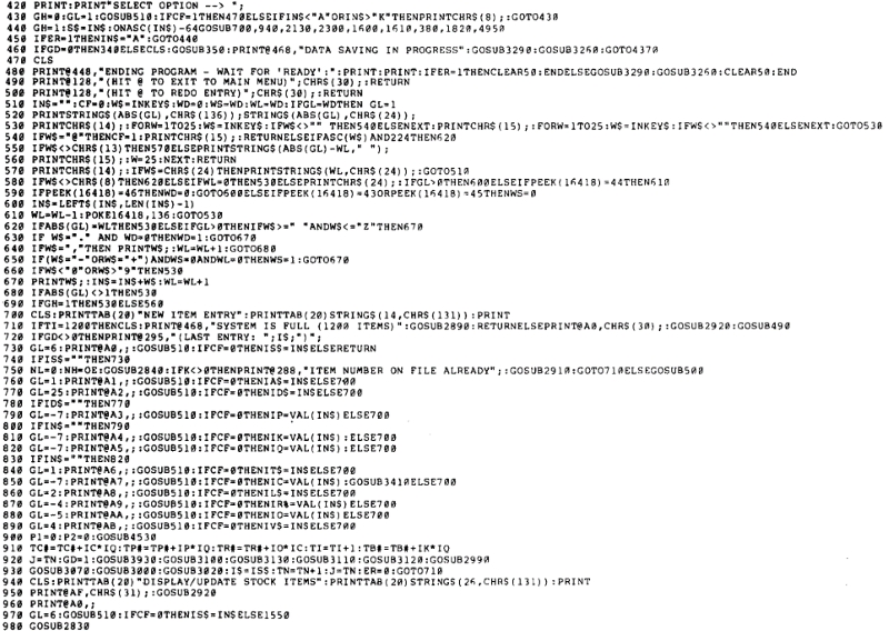 - The code is classic “spaghetti” code with many GOSUBS and GOTOS